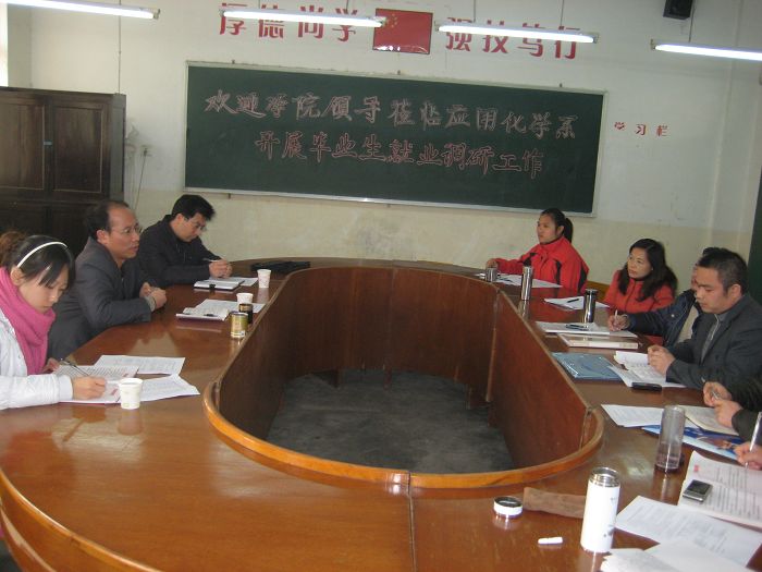 12月22日下午,学院副院长罗诗文来到应用化学系就2010届毕业生就业工作进行调研,招就处处长罗晓东、招就处干事陈钰杰陪同调研。应化系召开就业工作汇报会议,系主任赵凤英、书记胡孝贵、学工干事张江艳及毕业班班主任出席了汇报会。