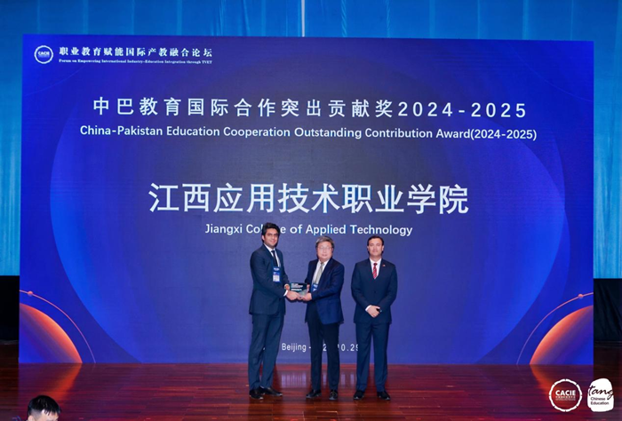 为表彰学校海外分校“中巴国土资源学院”为巴基斯坦教育和人才培养作出的突出贡献,巴基斯坦驻华大使馆空军参赞艾哈迈德·萨米和教育参赞苏夫扬·艾哈迈德·米安为学校颁发了“中巴教育国际合作突出贡献奖”(2024-2025)。