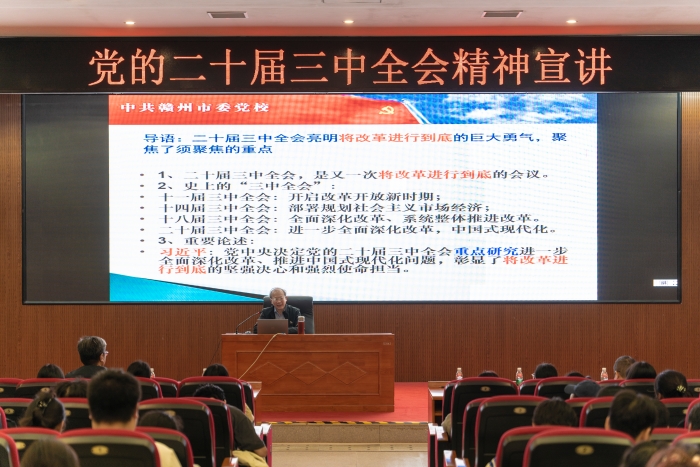 为进一步学习贯彻党的二十届三中全会精神,推动全会精神“进教材、进课堂、进头脑”,10月23日,江西省党建研究会理事、赣州市红色文化研究会“专家组”组长孙声荣在我校开展专题宣讲。宣讲以“坚持以将改革进行到底的巨大勇气 稳步推进全过程人民民主——党的二十届三中全会精神聚焦性解读”为主题。校党委书记张家菁出席并致辞。党委办公室(校长办公室)主任赵金洪、280余名师生代表参加活动。