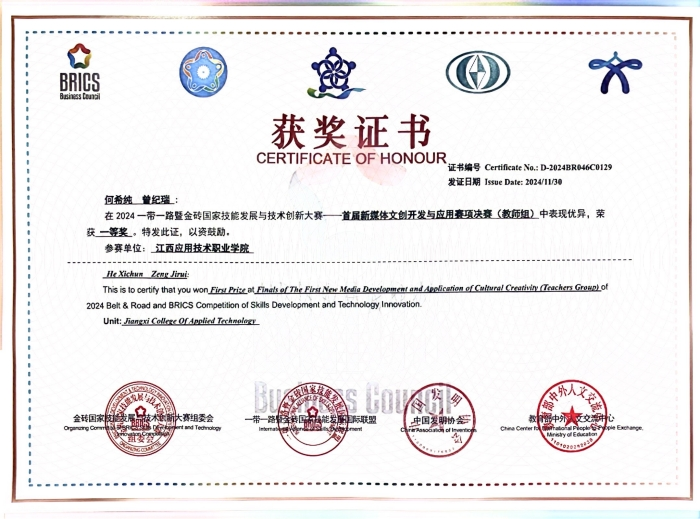 11月26日至30日,2024年一带一路暨金砖国家技能与技术创新大赛首届新媒体文创开发与应用赛项决赛在佛山市广东职业技术学院成功举办。该项赛事由金砖国家工商理事会中方理事会、一带一路暨金砖国家技能发展国际联盟、中国科协一带一路暨金砖国家技能发展与技术创新培训中心主办。比赛为期4天,吸引了全国99支队伍参与角逐。