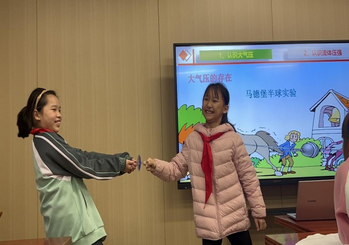 党员教师陈冬冬以“是谁托住了乒乓球?”“看不见摸不着的空气为什么能堵住矿泉水瓶?”两个生活化问题激发孩子好奇心,通过“不掉落的乒乓球”实验拉开序幕。当通电吹风机上方的乒乓球稳稳悬浮时,孩子们惊呼不已。活动结合实验讲解大气压强的产生原理,延伸介绍著名的马德堡半球实验,让孩子们直观感受大气压的力量。