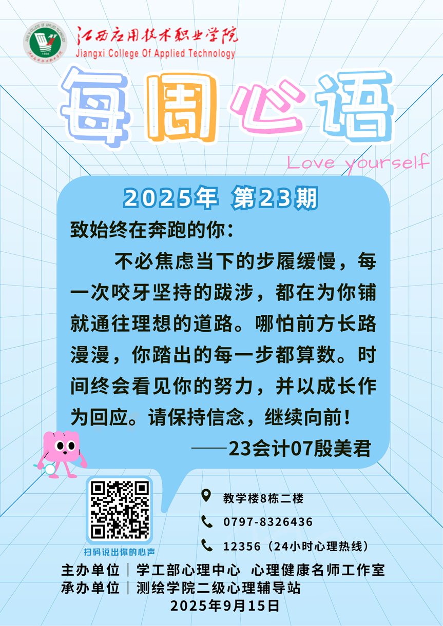 同学们,学生工作部心理健康教育与咨询中心推出了“每周心语”栏目,它是留言板、许愿池、宣泄桶,你不但可以向它分享快乐与烦恼,而且可以投稿“每周心语”美文,投稿成功会有小奖品,全校同学都能看见!